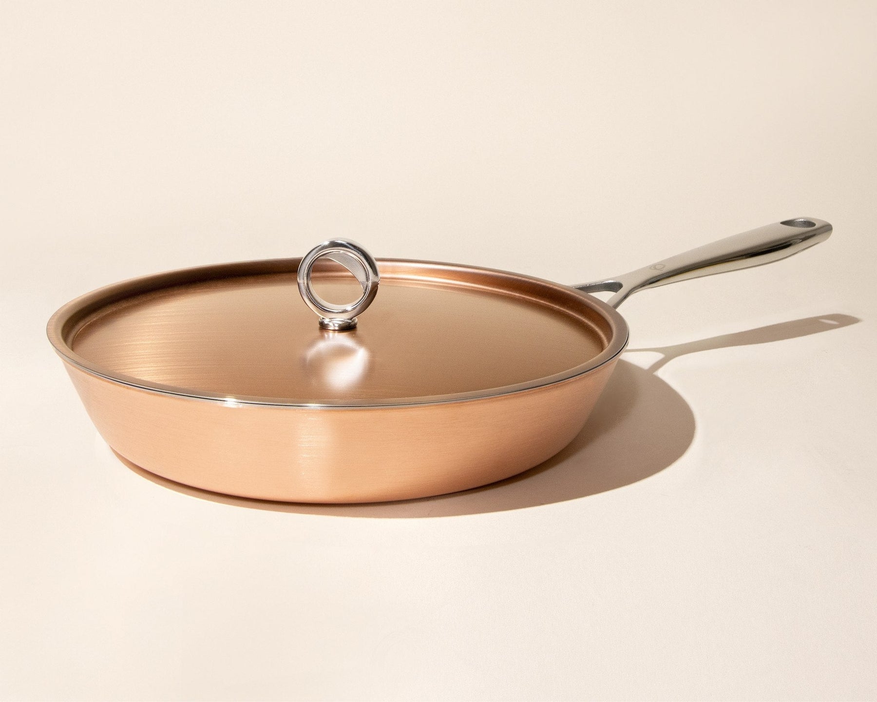 Die Olavson Kupferpfanne verbindet traditionelle Kupferqualität mit moderner Alltagstauglichkeit. Eine Edelstahl-Innenschicht sorgt für unbedenkliches Braten, während der ferromagnetische Boden die Pfanne induktionsfähig macht.