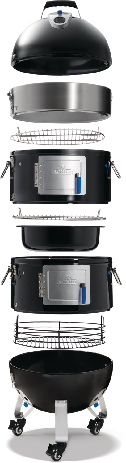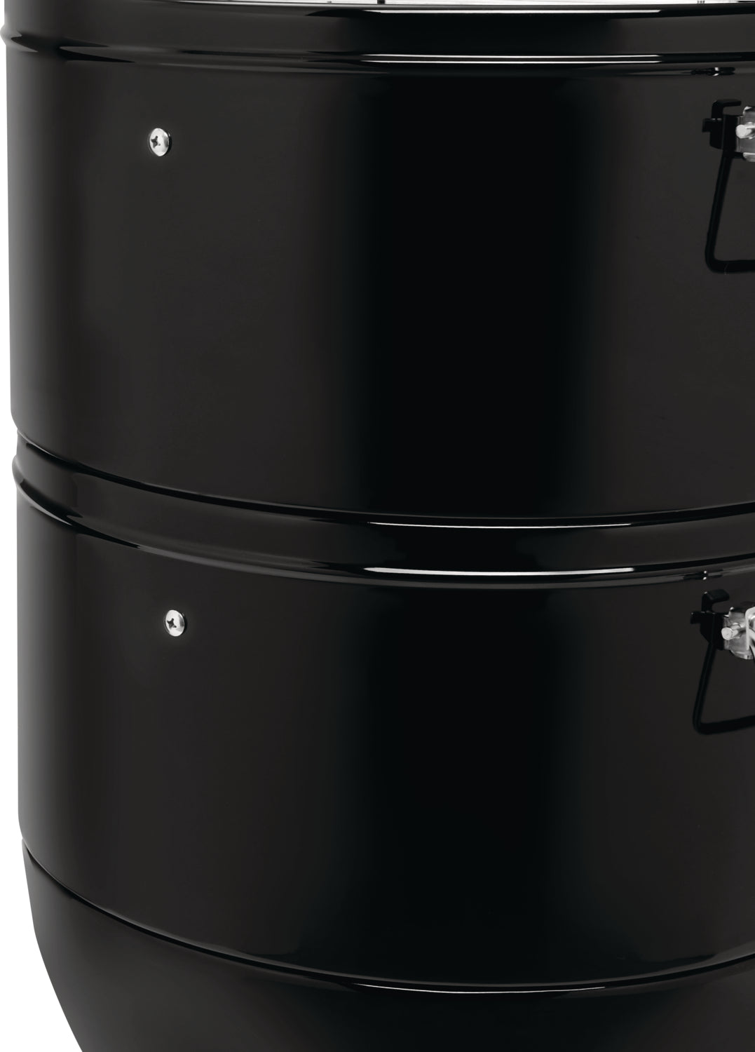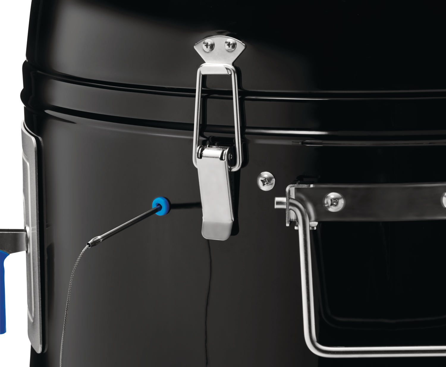 Große Türen erleichtern den Zugriff auf Wasserwanne und Brennraum, während die mit Silikon versiegelten Temperaturfühler-Anschlüsse die Nutzung externer Thermometer angenehm einfach gestalten. Dank fixierbarer Lenkrollen bleibt der Smoker stets stabil und lässt sich dennoch mühelos bewegen.