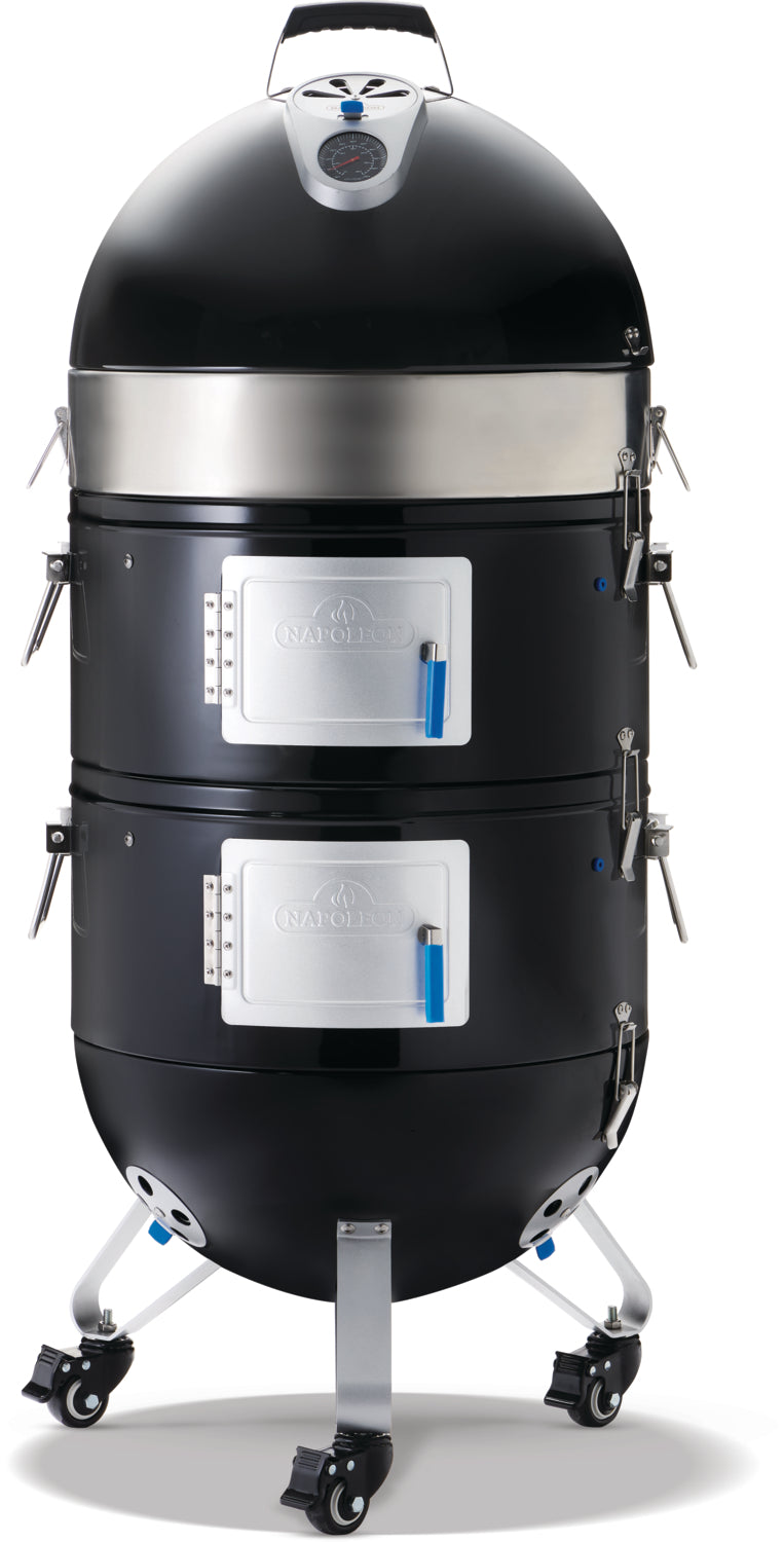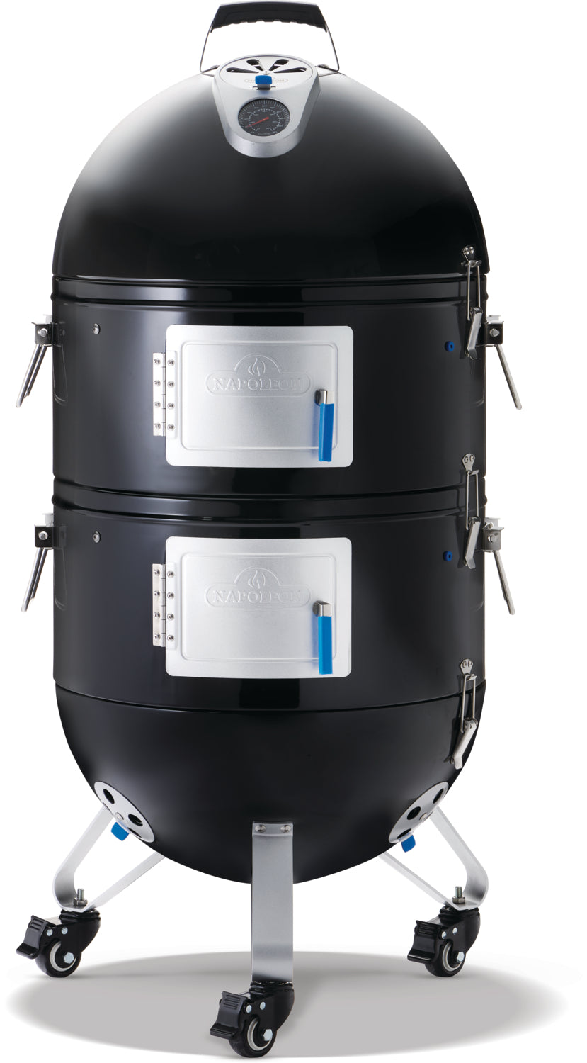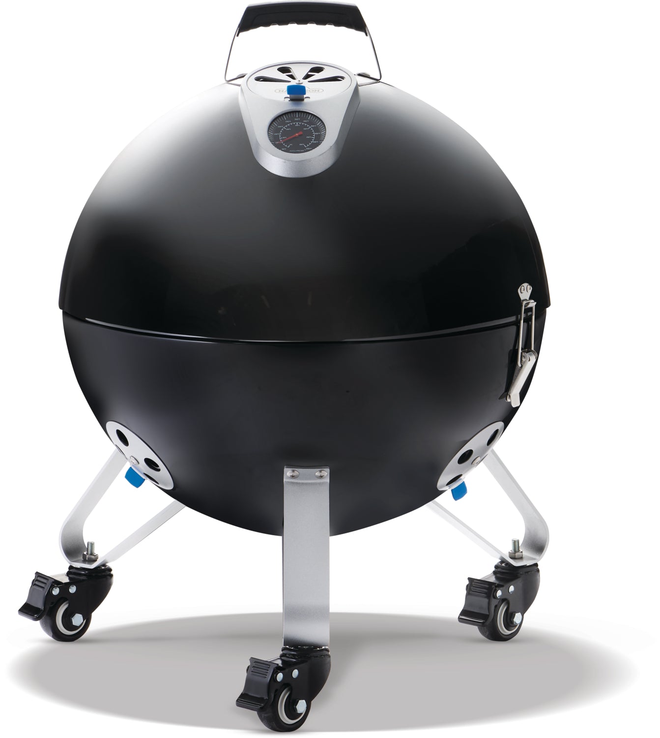 Große Türen erleichtern den Zugriff auf Wasserwanne und Brennraum, während die mit Silikon versiegelten Temperaturfühler-Anschlüsse die Nutzung externer Thermometer angenehm einfach gestalten. Dank fixierbarer Lenkrollen bleibt der Smoker stets stabil und lässt sich dennoch mühelos bewegen.