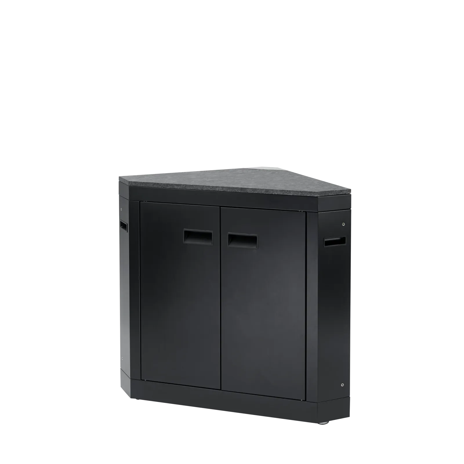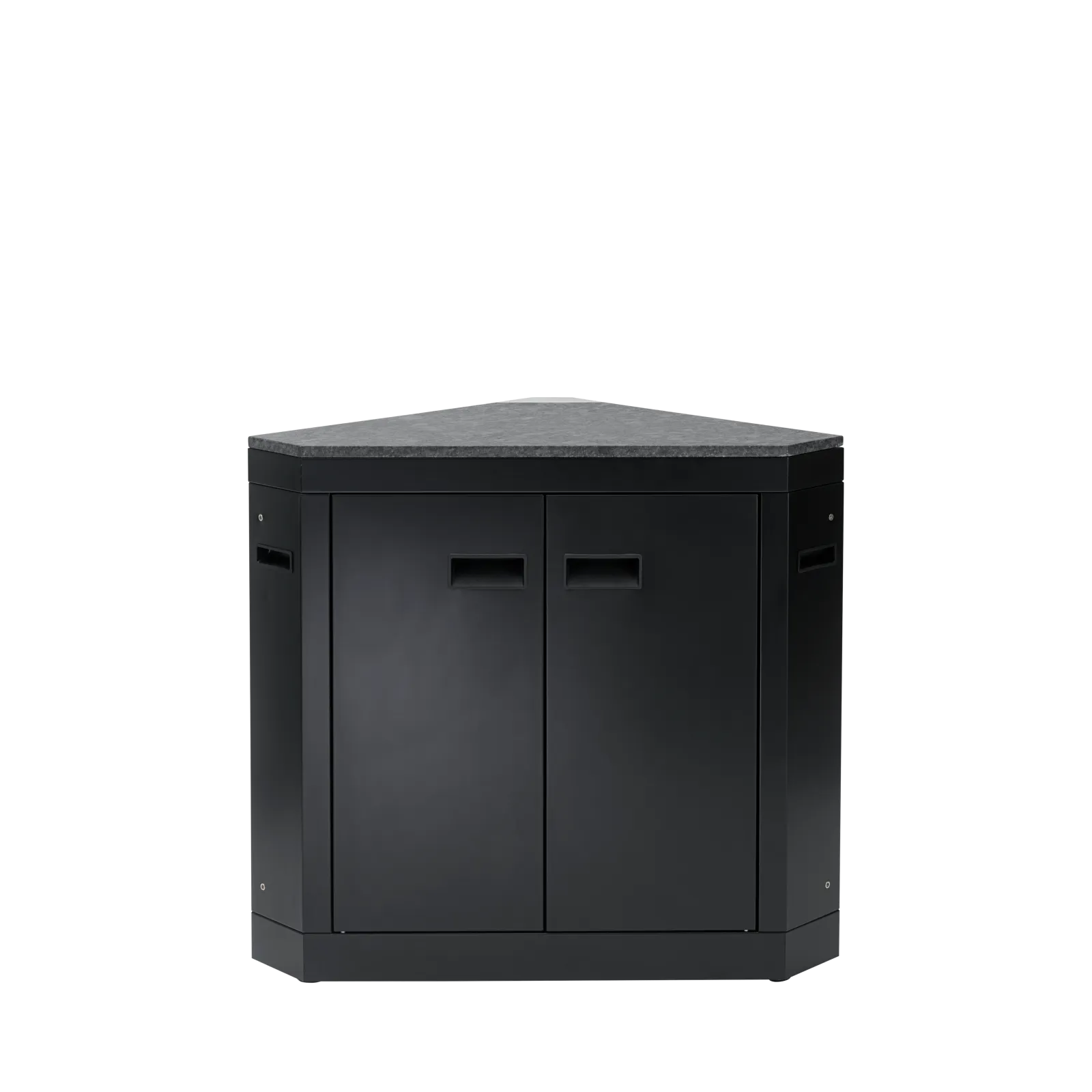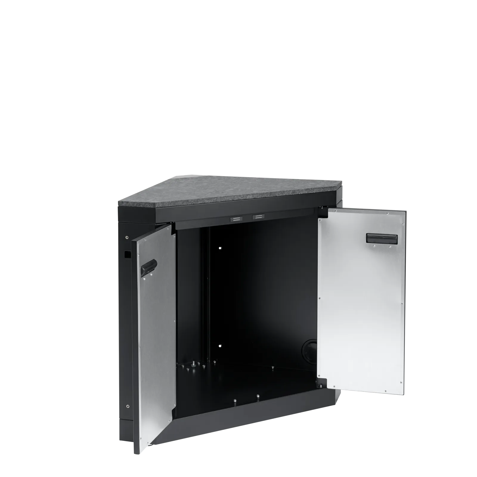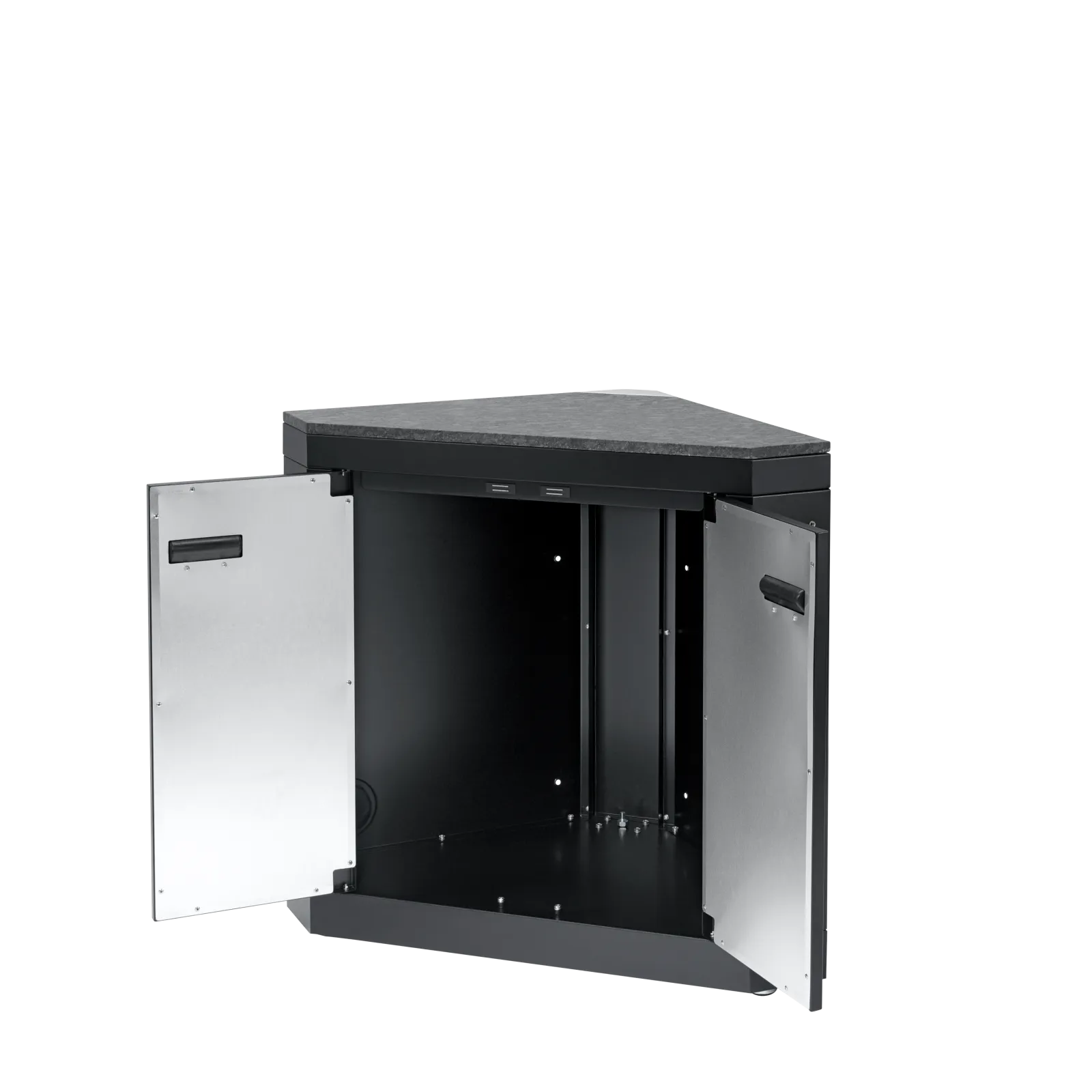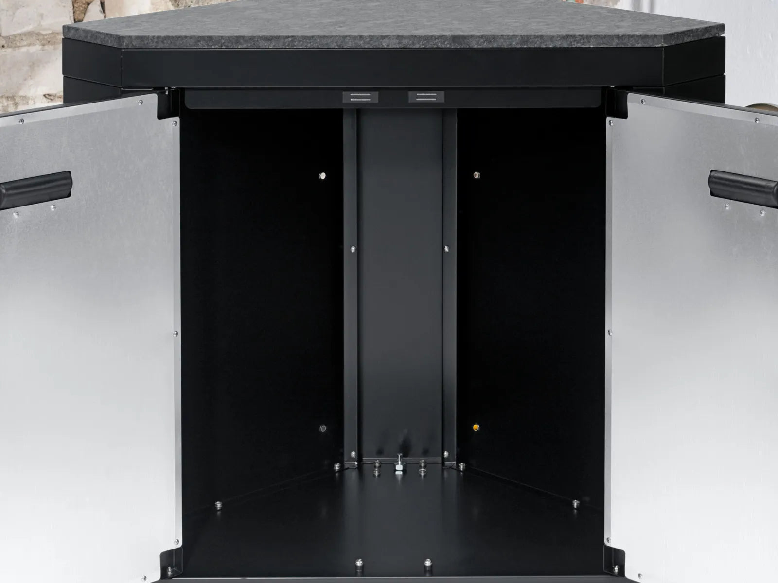 Neben der Erweiterung der Arbeitsfläche bietet das Eckmodul zusätzlichen Stauraum, der über zwei große Stahltüren an der Rückseite leicht zugänglich ist. Ob Grillzubehör, Zutaten oder Utensilien – hier findet alles seinen Platz. So bleibt deine Outdoor-Küche stets aufgeräumt und einsatzbereit.