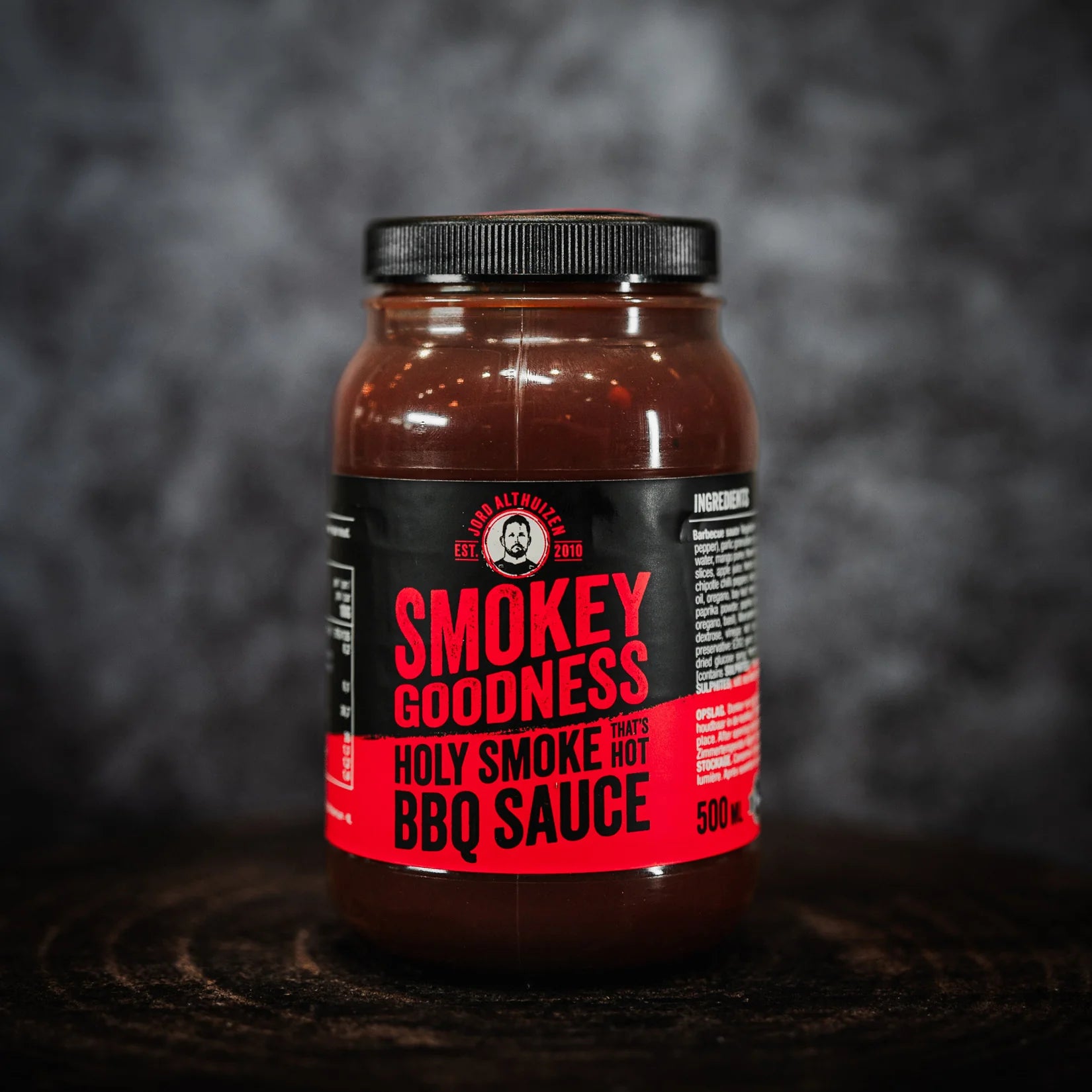 Diese BBQ-Sauce ist für alle, die es wirklich wissen wollen: Holy Smoke That’s Hot kombiniert Chipotle, feurige Chilischoten und ausgewählte Gewürze zu einer explosiven Geschmackskomposition. Nichts für Zaghafte – aber ein echter Hochgenuss für alle, die Schärfe lieben.