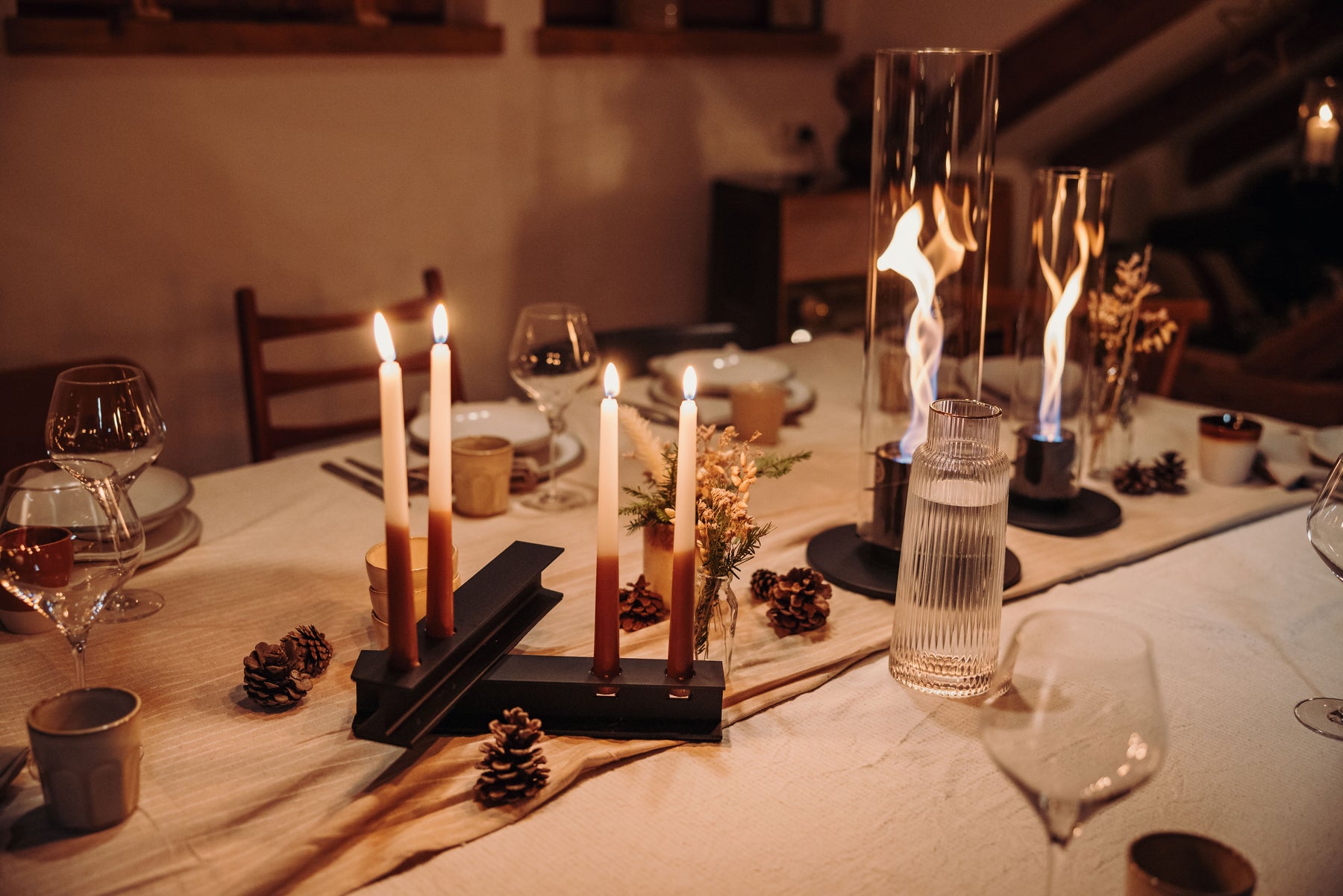 Die präzise gefertigten Kerzenaufnahmen halten Stab- und Stearinkerzen (Ø 20–25 mm, max. Länge 250 mm) sicher an ihrem Platz, während die Filzunterlage empfindliche Oberflächen schützt und die optimale Positionierung erleichtert.